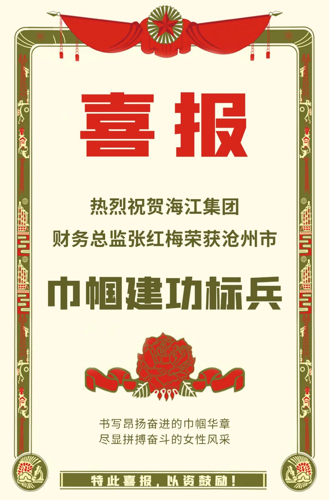 ? ? Recently, Cangzhou Women's Federation commended the advanced collectives and advanced individuals who emerged in the " Job Building Activities for Women in Cangzhou City".?Zhang Hongmei, CFO of Haijiang Group, was awarded the honorary title of ""Women's Merit Award" for her enterprising and innovative efforts, and for her passion and vigorous spirit in building work in the enterprise development and making outstanding contributions to the economic development of Cangzhou City.
