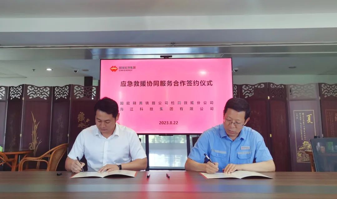 ? ? On the morning of August 22, The signing ceremony of emergency rescue cooperative service cooperation between the Testing and Rescue Branch of Guoneng Shuohuang Railway Development Co., Ltd. and Haijiang Technology Group Co., Ltd. was officially held to further strengthen the construction of the emergency rescue team, give full play to the equipment advantages of the professional rescue team and technological advantages, to ensure effective and timely rescue in the event of production safety accidents, and maximize the protection of railroad transportation safety and smooth flow.