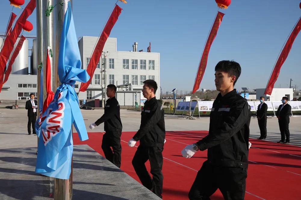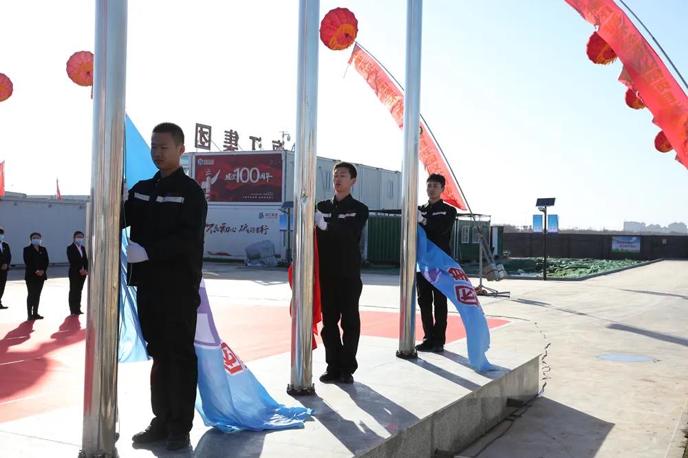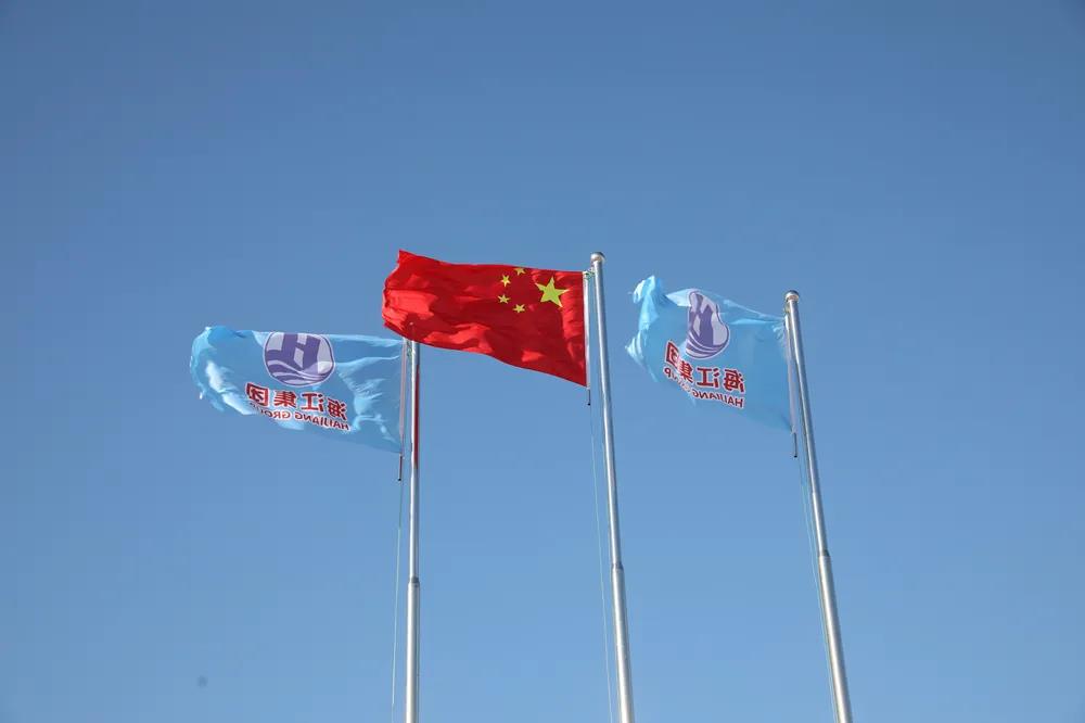 伴隨著激昂的《義勇軍進行曲》響徹園區上空,鮮艷的五星紅旗及海江集團司旗冉冉升起,全體員工行注目禮。三面旗幟錯落有致,在園區前迎風飄揚。