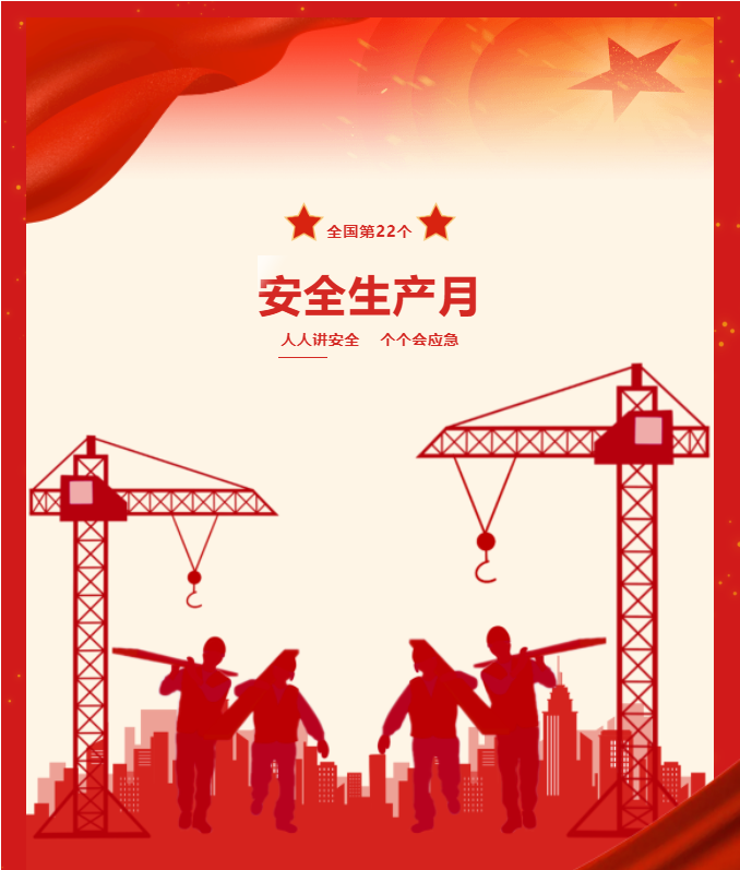 ? ? 今年6月是全國第22個安全生產月,圍繞“人人講安全、個個會應急”主題,我們要深入學習領會習近平總書記關于安全生產重要論述,推動樹牢安全發展理念,落實安全生產責任,開展重大事故隱患排查,提升全員安全意識和應急處置能力,全力抓好集團及各項目部安全防范工作,堅決穩控安全形勢,肩負起自身的責任,協同推進,立足實戰,為集團安全保障工作筑牢銅墻鐵壁。