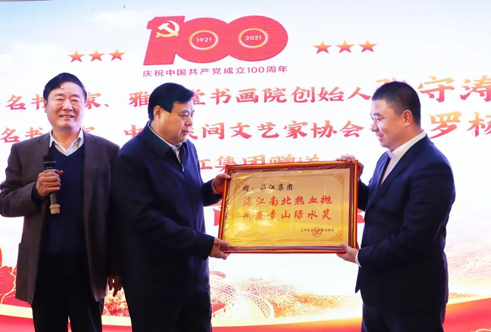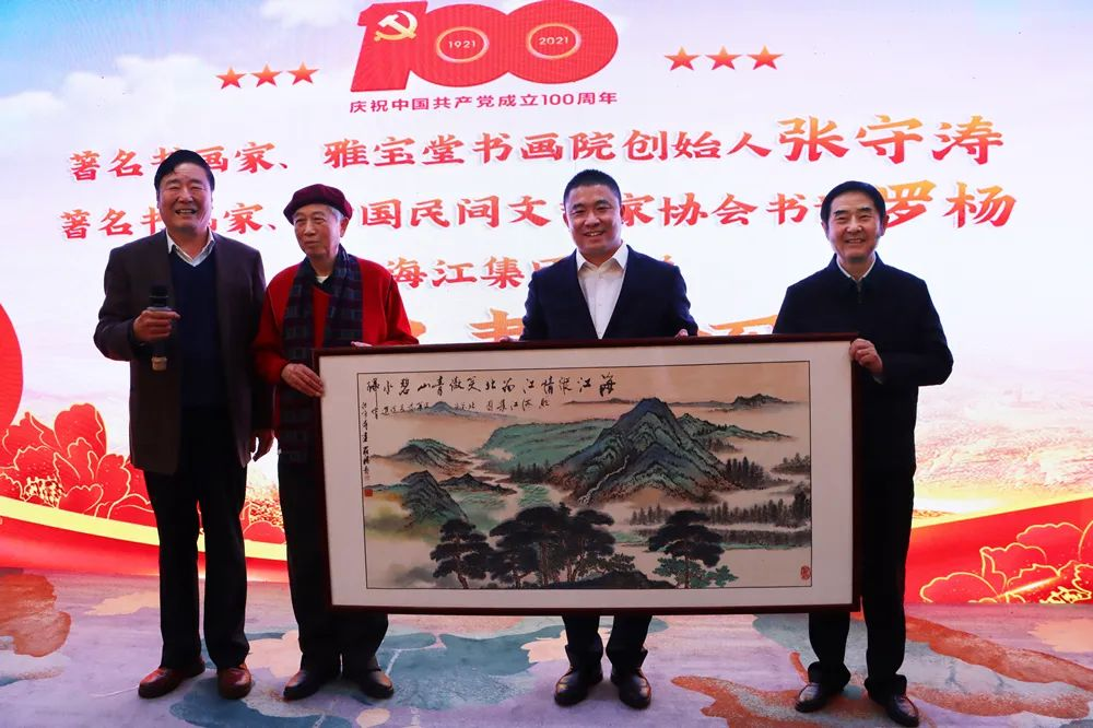百年輝煌映日月,百家書畫譜新篇。2022年1月16日,建黨百年百家書畫邀請展暨北京市企業發展促進會第二屆理事會第三次會議在北京維也納國際酒店隆重開幕。此次展覽展出了包括中國國畫家協會主席雷正民、原北京市副市長孫安民、中國國際書畫藝術促進會會長張守濤、中央文史館特約研究員羅楊等的作品100多幅,涵蓋了中國畫、油畫、書法、篆刻、剪紙等多種藝術形式,回顧和展示了中國共產黨100年來走過的光輝歷程,熱情謳歌了建黨以來所取得的光輝業績和偉大成就。海江集團董事長劉海江、黨支部書記高琪鎣、總裁褚龍、副總李國棟等應邀出席。